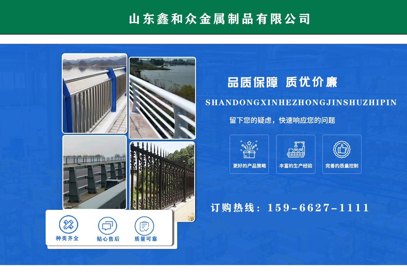 山东鑫和众金属制品有限公司主要产品有防撞护栏,桥梁护栏,道路护栏,河道护栏,不锈钢护栏等护栏。提供设计方案,一站式定制,包您满意价格优惠,欢迎来电咨询! 公司常年从事销售护栏防撞护栏,桥梁护栏,道路护栏,河道护栏,不锈钢护栏,桥梁钢护栏,河道灯光护栏等。产品广泛应用于桥梁、河道、旅游景区、道路、公路、公园、小区、景观、道路防撞等领域?! 」静肪捎糜胖什恍飧植牧希舷喙乇曜?。各种型号不锈钢复合管及护栏,质量严格把控。产品强度高、耐腐蚀、焊接牢固、抗冲击、性能好,防撞护栏结构简单、美观实用大方。 欢迎前来订购!...